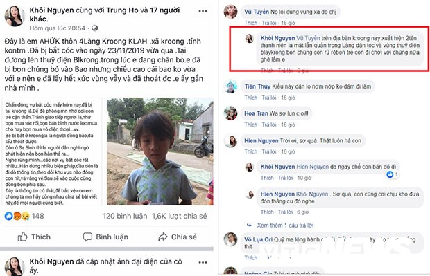 Trước đó, tài khoản Facebook có tên Khôi Nguyễn có đăng tải bài viết với nội dung em A Hưk, SN 2008, trú thôn 4, làng Kroong Klah, xã Kroong, TP.Kon Tum khi đang đi chăn bò đã bị bắt cóc.